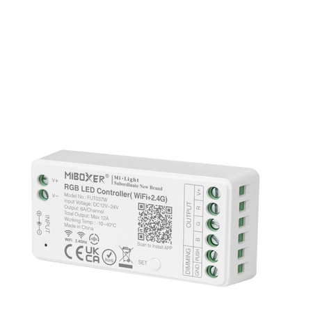 Moc kontrolera równa jest 12A (144W przy instalacji 12V i 288W przy instalacji 24V). Wbudowana dioda sygnalizacyjna pozwala na szybką diagnozę i przypisanie kontrolera Kontroler Mi-light FUT037W do taśm LED RGB 12A WiFi do pilota bez podłączania taśmy LED. Wbudowany moduł Wi-Fi umożliwia sterowanie urządzeniem bezpośrednio z aplikacji (mostek Wi-Fi WL-BOX1 nie jest wymagany).