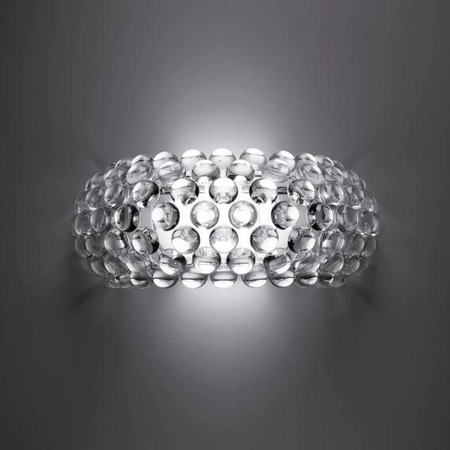 Lampa ścienna Foscarini Caboche media w kolorze srebrnym swój kryształowy design zawdzięcza Elianie Gerotto oraz Patricii Urquioli. Inpiracją do stworzenia tej lampy była dla projektantek bransoletka z błyszczących przezroczystych pereł. Owe perły wsparte zostały przezroczystym i solidnym zawiesiem, a całość idealnie prezentuje się w otoczeniu salonowych dzieł sztuki, ale także w zaciszu domowej sypialni. Lampa ścienna Foscarini 13802516 Caboche media występuje w dwóch kolorach oraz jest dostępna jako lampa stołowa, podłogowa i sufitowa. Ścienny model Foscarini Caboche dostępny jest także w dwóch rozmiarach. Żarówka jest sprzedawana oddzielnie.