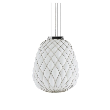 Designerska lampa wisząca Pinecone w większej wersji to eleganckie oświetlenie główne do salonu czy sypialni. Występuje w kilku kolorach. Lampa Fontana Arte Pinecone powstała dzięki starożytnej metodzie wydmuchiwania szkła do metalowej klatki. Dzięki temu szkło rozszerza się między otworami, sprawiając wrażenie obiektu zawieszonego w akcie ucieczki. Klatka jest dodatkowo wzmocniona przez obróbkę galwaniczną, która poprawia jej wygląd, dzięki czemu jest błyszcząca i lśniąca. Atutem białej lampy designerskiej jest również możliwość ściemniania. Żarówki brak w zestawie.