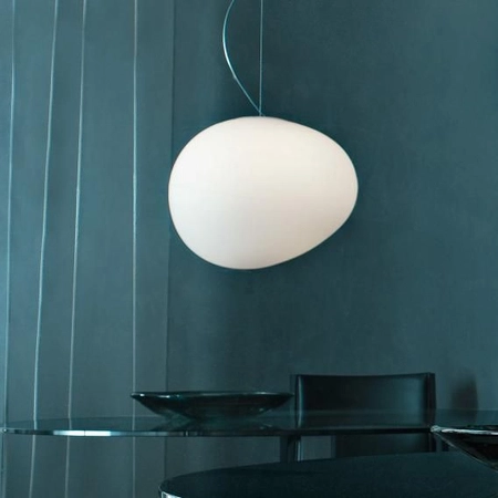 Kształt dużego kamyka wypolerowanego przez wodę był inspiracją do stworzenia designerskiej lampy wiszącej Foscarini Gregg media. Za projekt tego modelu odpowiedzialni są Ludovica i Roberto Palomba. Lampa została wykonana z ręcznie dmuchanego szkła i sprawdzi się zarówno w kuchni, jak i większych, bardziej eleganckich pomieszczeniach. Lampa wisząca Foscarini 168007E-10 Gregg media dostępna jest w trzech rozmiarach, w którym każdy z nich posiada trzy warianty kolorystyczne. Ponadto lampy Foscarini Gregg media występują jako lampy stołowe i podłogowe, także w wielu rozmiarach i wersjach kolorystycznych. Żarówki są sprzedawane oddzielnie.